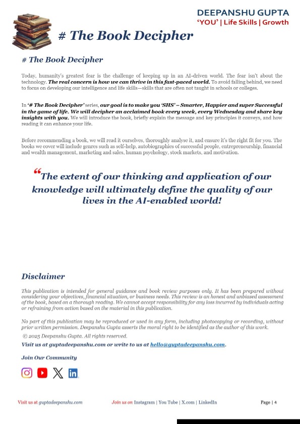 Today, humanity's greatest fear is the challenge of keeping up in an AI-driven world. The fear isn't about the technology. The real concern is how we can thrive in this fast-paced world. To avoid falling behind, we need to focus on developing our intelligence and life skills—skills that are often not taught in schools or colleges. In ‘# The Book Decipher’ series, our goal is to make you ‘SHS’ – Smarter, Happier and super Successful in the game of life. We will decipher an acclaimed book every week, every Wednesday and share key insights with you. We will introduce the book, briefly explain the message and key principles it conveys, and how reading it can enhance your life. Before recommending a book, we will read it ourselves, thoroughly analyse it, and ensure it's the right fit for you. The books we cover will include genres such as self-help, autobiographies of successful people, entrepreneurship, financial and wealth management, marketing and sales, human psychology, stock markets, and motivation.